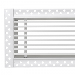 Данная решетка подходит для монтажа на любую поверхность под финишную отделку. Рамка и экран изготовлены из алюминия, опора экрана - из оцинкованной стали. Рама оснащена «полкой» 1,9 мм и рифлеными краями для большей адгезии финишного материала – шпатлевки, цемента. Решетка имеет съемную центральную часть с фиксированным углом наклона ламелей 0°. Она крепится к корпусу прочными металлическими тросиками, легко снимается для очистки и удобного обслуживания.