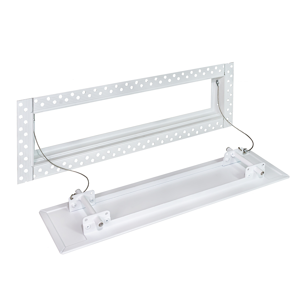 Данная решетка подходит для монтажа на любую поверхность под финишную отделку. Рама оснащена «полкой» 1,9 мм и рифлеными краями для большей адгезии финишного материала – шпатлевки, цемента. Решетка имеет съемную центральную часть с декоративным экраном. Она крепится к корпусу прочными металлическими тросиками, легко снимается для очистки и удобного обслуживания.