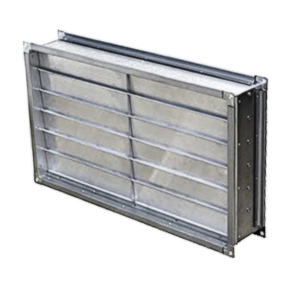 Корпус клапана с прямоугольными фланцами изготовлен из оцинкованной стали, внутрь которого вставлены алюминиевые лопасти инерционной решетки.