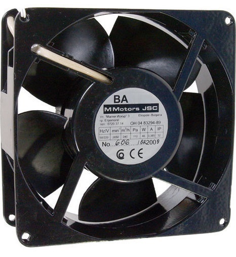 Корпус изготовлен из алюминия, лопасти вентилятора - из жаропрочного пластика (стеклонаполненного полиамиада). В двигателе используются радиальные шариковые подшипники закрытого типа, что гарантирует низкий уровень шума и безотказную работу вентилятора в течение 30 000 часов. Габариты: 150х150х55 мм.