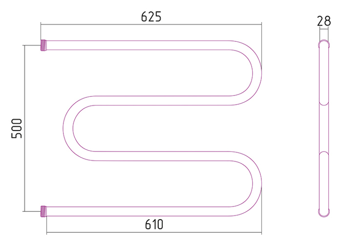 Водяной полотенцесушитель Стилье, модельного ряда «М-образный», серии Классика, с внешними габаритами – 500 мм в высоту, и 650 мм в ширину.