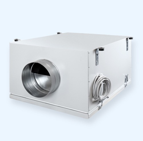Приточная установка оснащена фильтром класса G4, электрическим нагревателем и вентилятором. Установка оборудована электронно-коммутируемым ЕС двигателем. Защита двигателя вентилятора осуществляется встроенными термоконтактами. Трехфазные электрические нагреватели оснащены двухступенчатой защитой от перегрева. Первая ступень настроена на +60°С и перезапускается автоматически, вторая ступень настроена на +110°С и перезапускается вручную.
