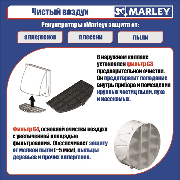 • Рекуператор «Marley» проветрит помещение, не допустит запотевания окна и образования плесени или грибка в Вашем доме.