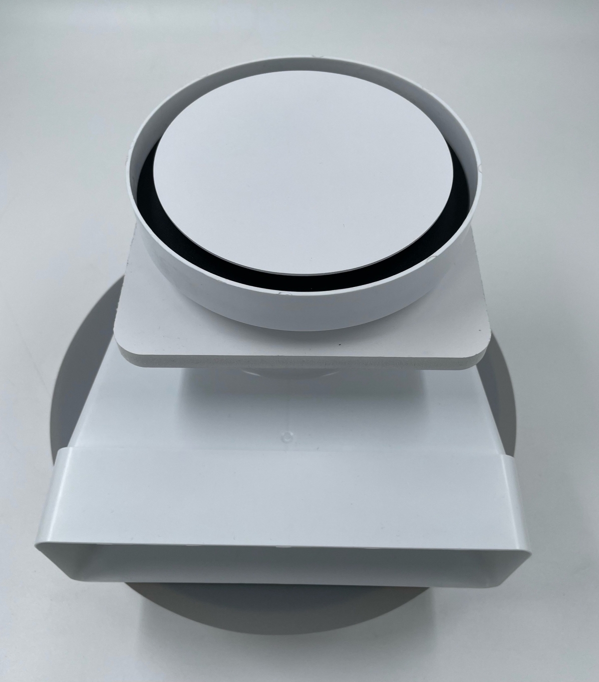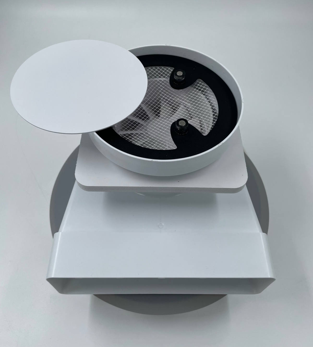 Решетки сделаны из высококачественного пластика и стали и покрашены в белый матовый цвет муар, который идеально сочетается с цветом и текстурой полотна потолка. Центральный диск держится на неодимовых магнитах.